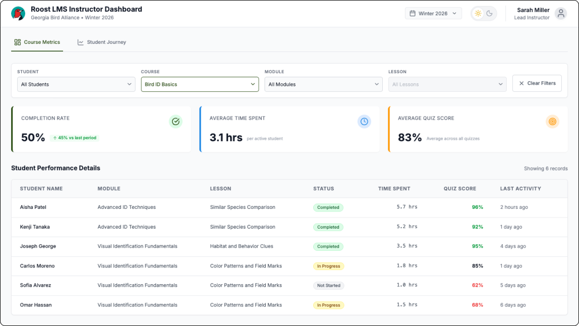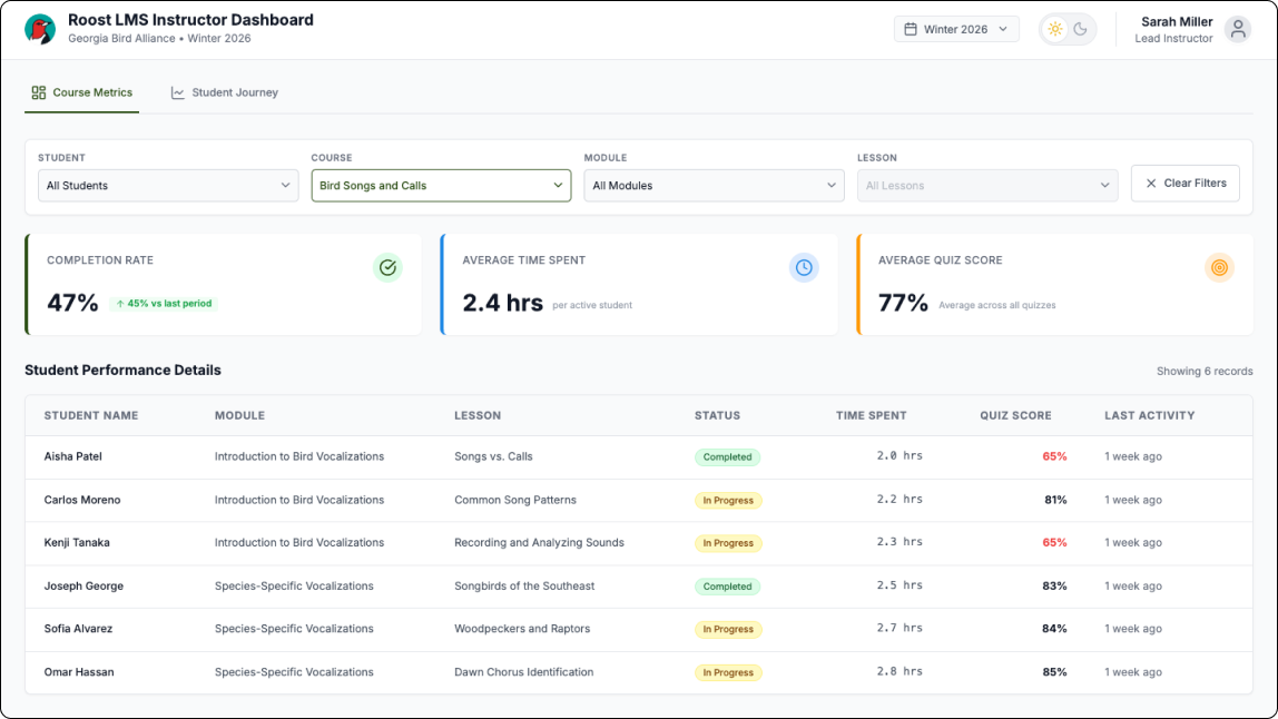 Instructors had no visibility into who was struggling or where they were getting stuck. Without performance data, they couldn't reach out to students, making the LMS a stagnant reference guide rather than an active learning tool.